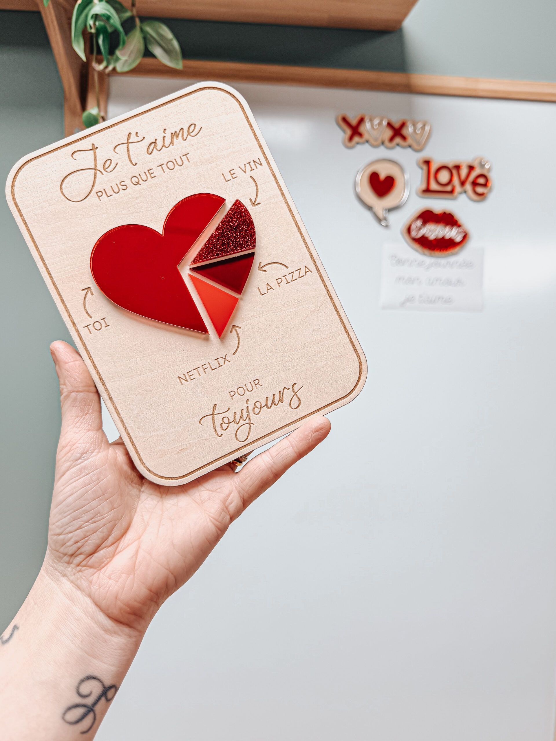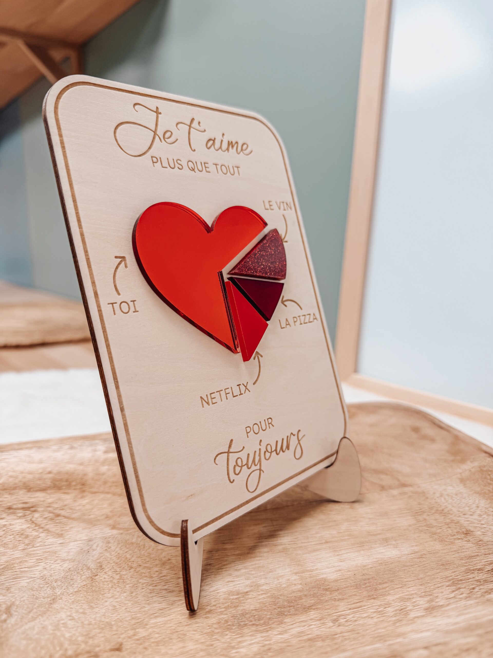 Une déclaration d’amour rigolote en bois gravée et sublimé par un cœur en relief