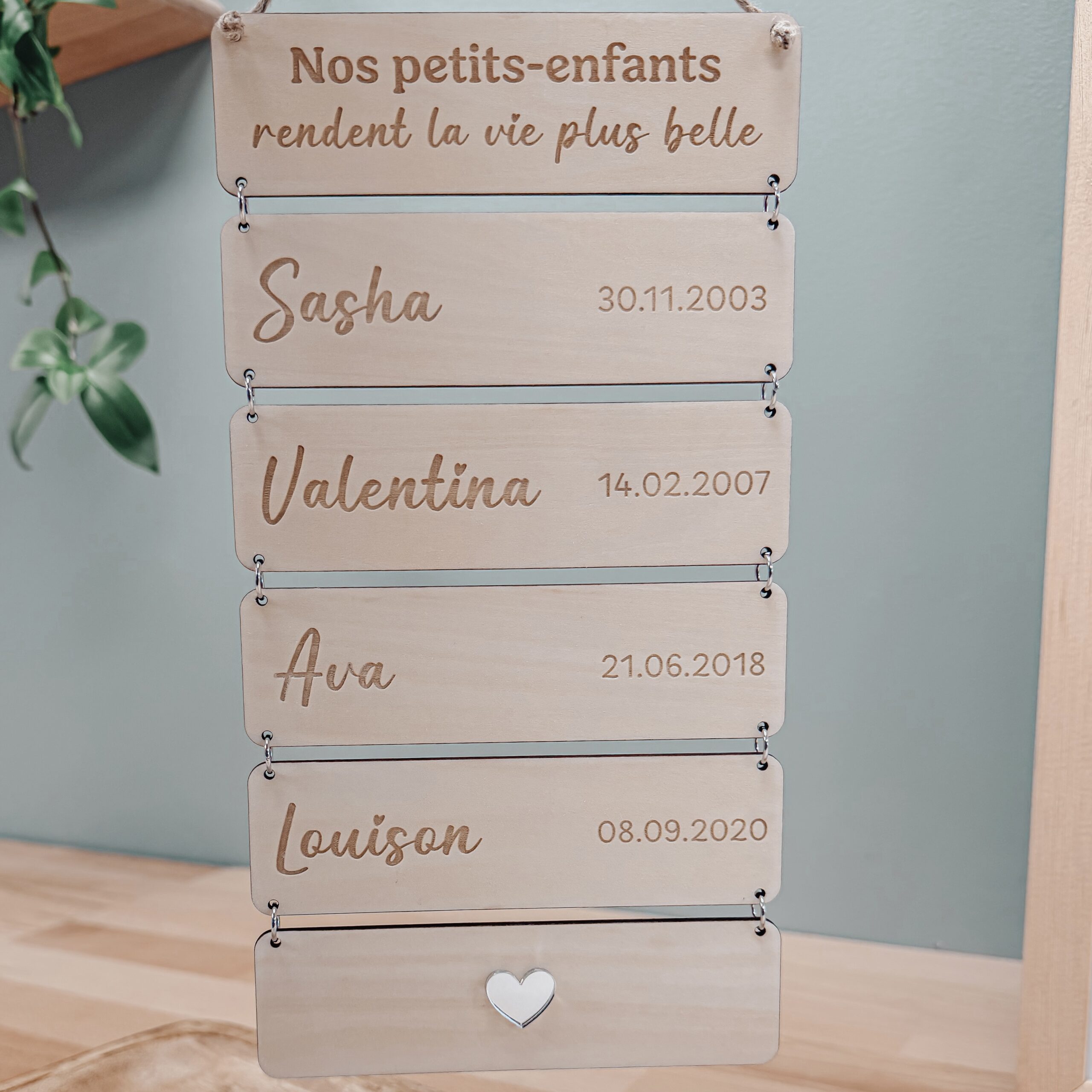 Cette pancarte en bois est un petit trésor familial, chaque plaque porte le prénom de l’enfant et sa date de naissance;