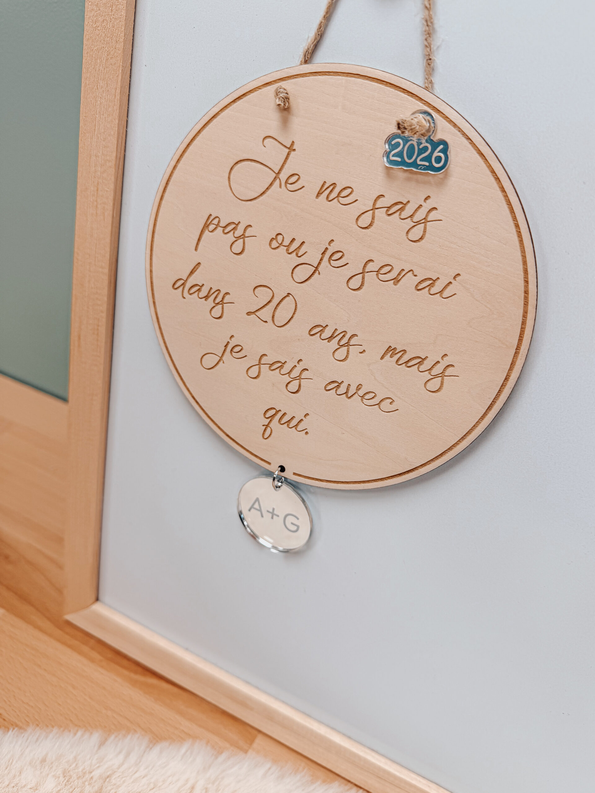 Une phrase qui traverse le temps, gravée dans le bois, accompagnée de son médaillon personnalisé et de la pampille avec l’année à laquelle il a été offert.