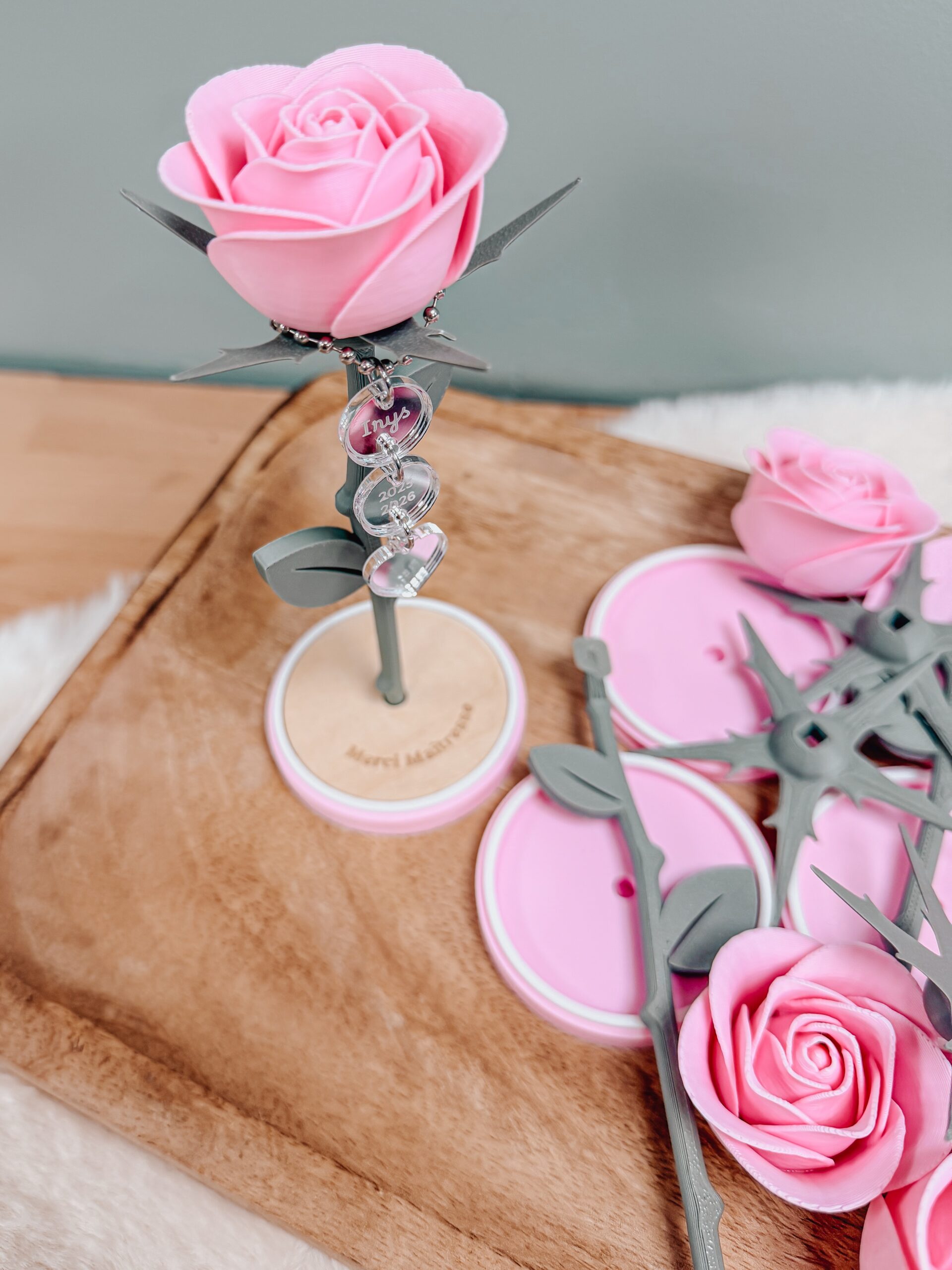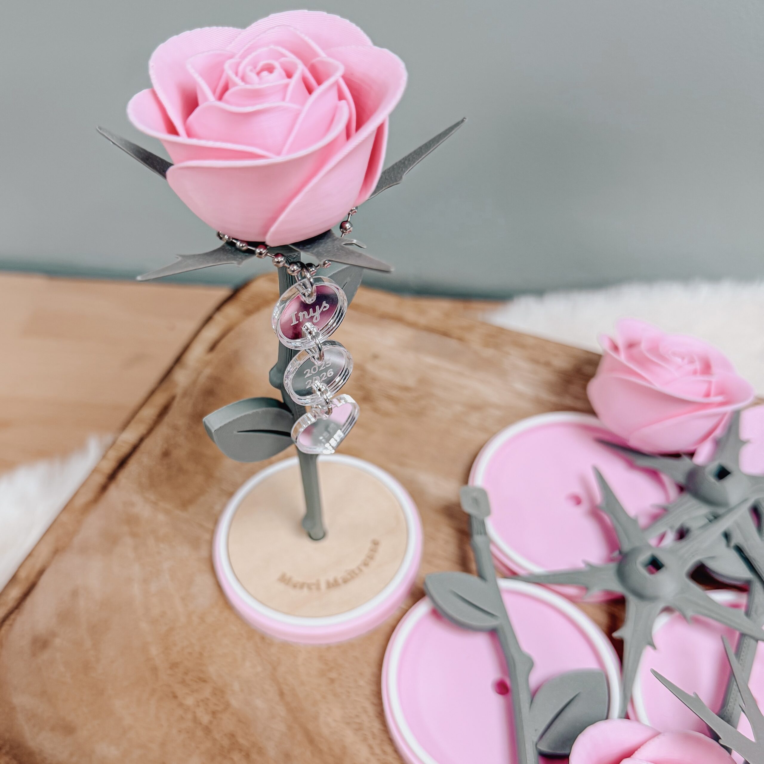 Cette délicate rose décorative est montée sur un socle en bois gravé et peut être personnalisée avec des pampilles miroir gravées.