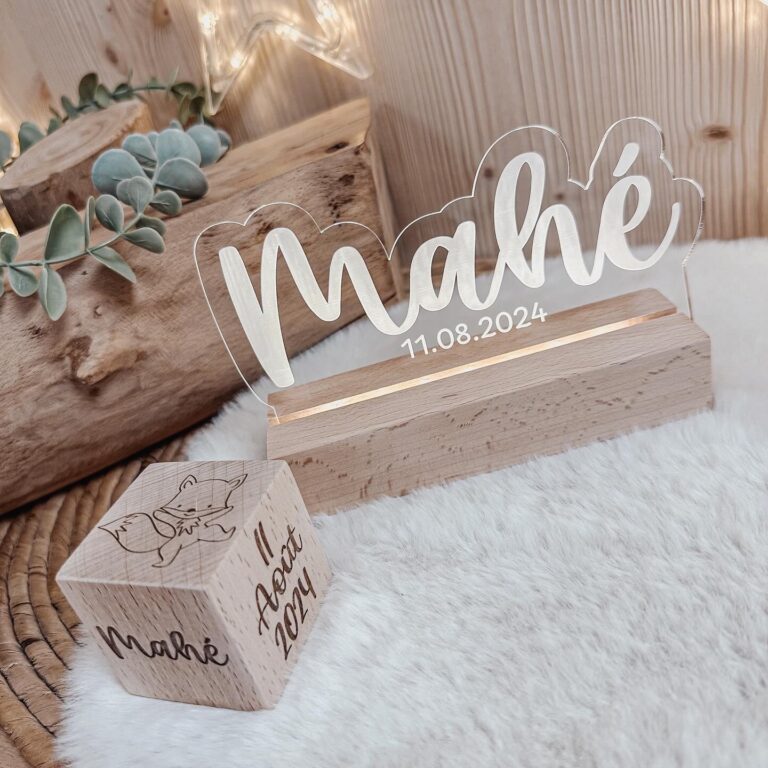 base bois +plaque acrylique (taille suivant longueur du prénom environ 17 cm de large et 8.2 cm de haut)